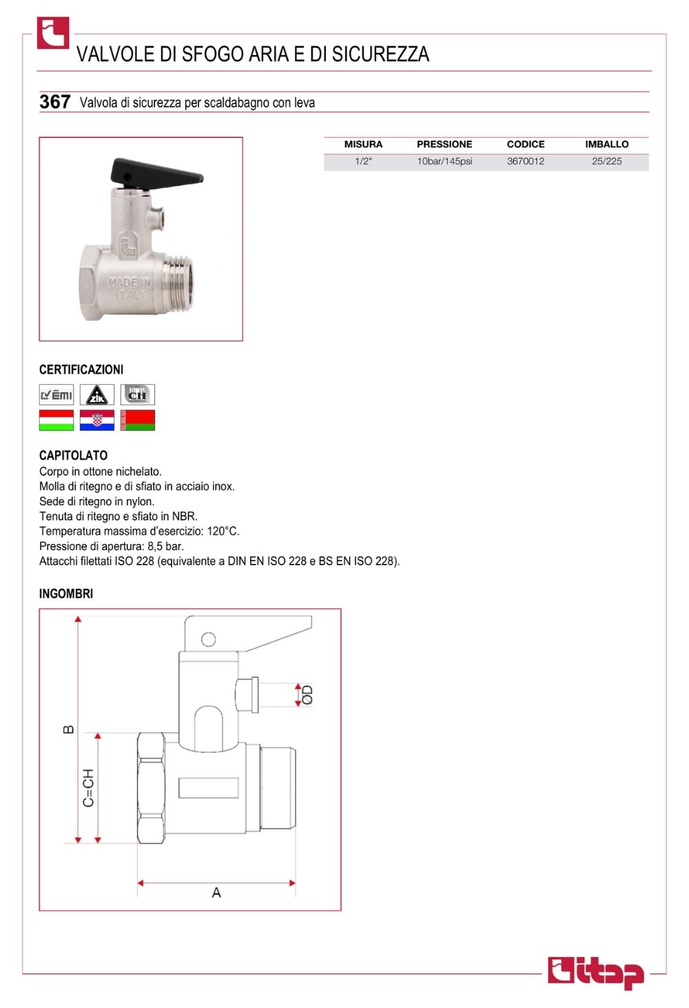 Van an toàn ITAP 367 là thiết bị chuyên dùng để bảo vệ bình nước nóng và hệ thống đường ống khỏi tình trạng quá áp. Sản phẩm được thiết kế tích hợp 2 chức năng: van an toàn + van một chiều, giúp tối ưu hiệu quả sử dụng và tiết kiệm chi phí lắp đặt.